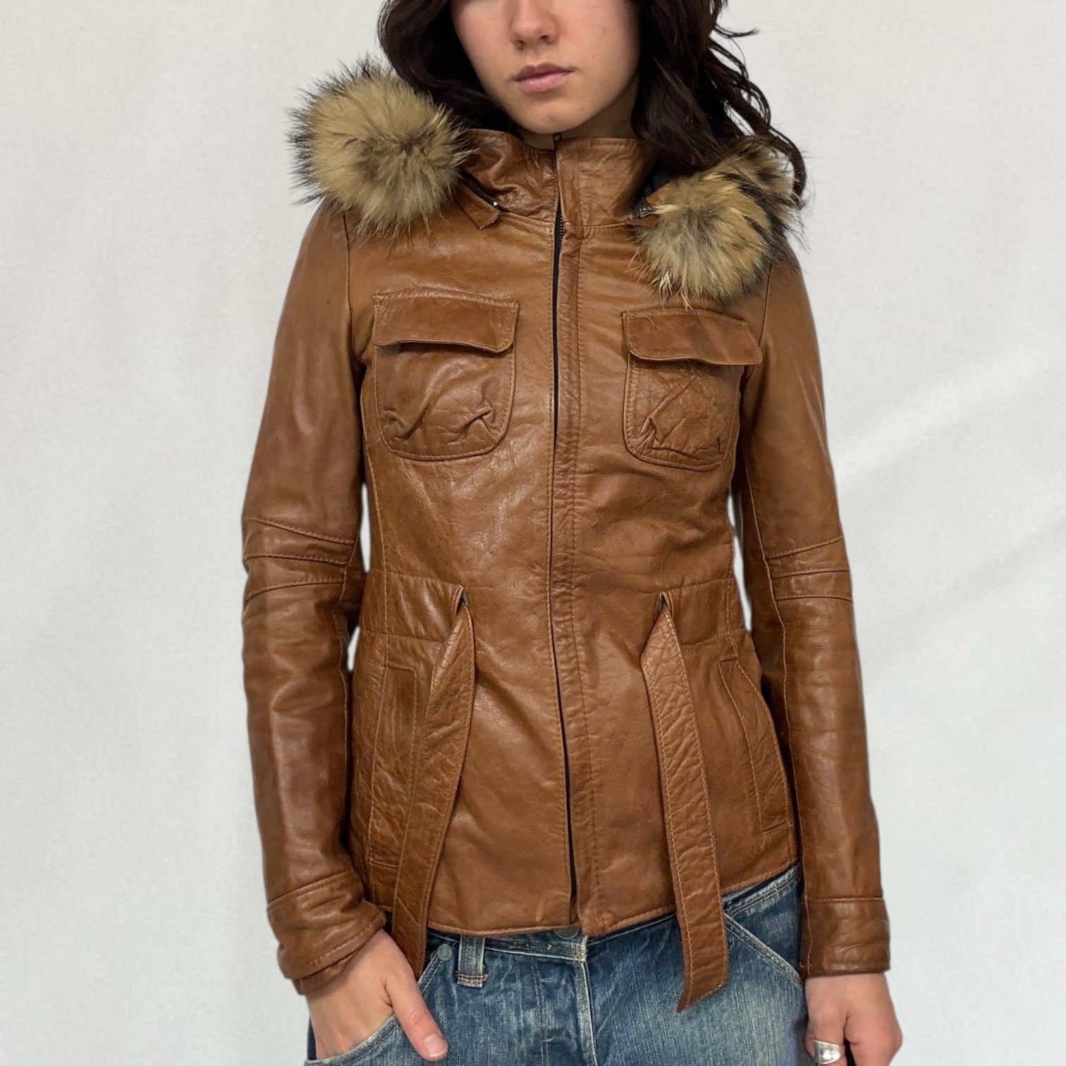 Brown leather jacket with fur collar trim